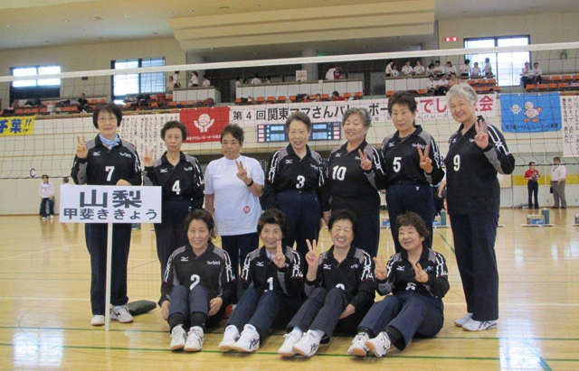 山梨県甲斐市の今年結成した「甲斐ききょう」というホヤホヤのチームです。このたび、8月10日の第4回関東ママさんバレーなでしこ大会に参加させて頂きました。日本一暑い埼玉県蓮田市総合市民体育館で、メンバー11名で行ってきました。