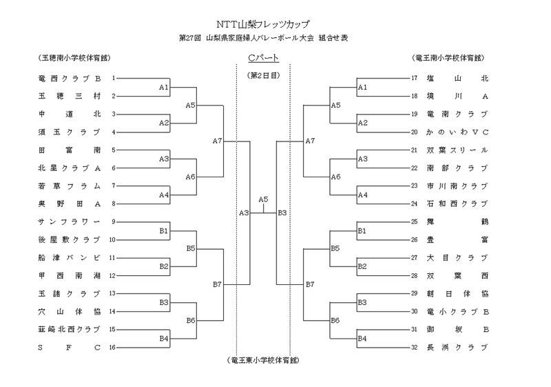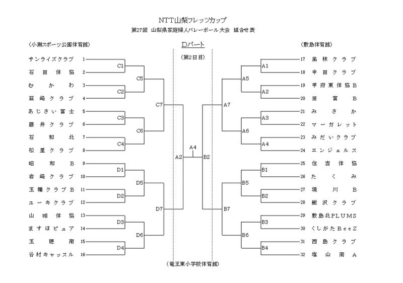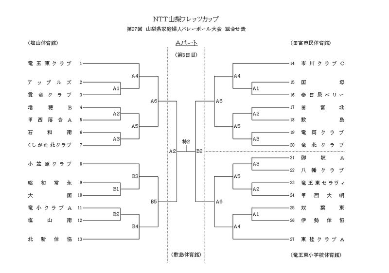 第27回 NTT山梨フレッツカップ : 各パート組合せ 武田消毒カップ 2011.02.052018.11.28 各パート組合せ ※下方の各パートからご覧ください。 ▼Aパート組合せ ※ ←クリックにて別ウィンドウ表示します。 ▼Bパート組合せ ※ ←クリックにて別ウィンドウ表示します。 ▼Cパート組合せ ※ ←クリックにて別ウィンドウ表示します。 ▼Dパート組合せ ※ ←クリックにて別ウィンドウ表示します。 ▼Eパート組合せ ※ ←クリックにて別ウィンドウ表示します。