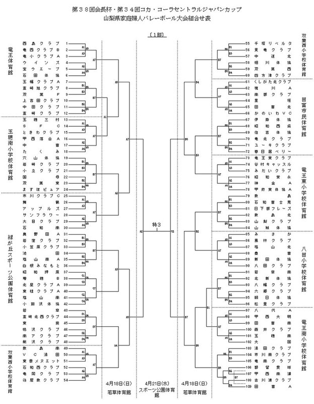 第38回 会長杯 第34回 コカ・コーラセントラルジャパンカップ 会長杯/コカ・コーラボトラーズジャパン 2010.03.202018.11.28 出場全チーム一覧 & 1部2部3部・組合せ表 ▼出場全チーム一覧 ※ ←クリックにて別ウィンドウ表示します。 ▼1部・組合せ表 ※ ←クリックにて別ウィンドウ表示します。 ▼2部・組合せ表 ※ ←クリックにて別ウィンドウ表示します。 ▼3部・組合せ表 ※ ←クリックにて別ウィンドウ表示します。