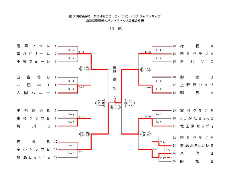 ■ 1部 優勝 : 東桂クラブA ■ 2部 優勝 : 御坂 ■ 3部 優勝 : あじさい富士 ▼1部 ※ ←クリックにて別ウィンドウ表示します。 ▼2部 ※ ←クリックにて別ウィンドウ表示します。 ▼3部 ※ ←クリックにて別ウィンドウ表示します。
