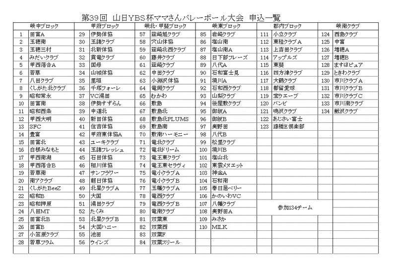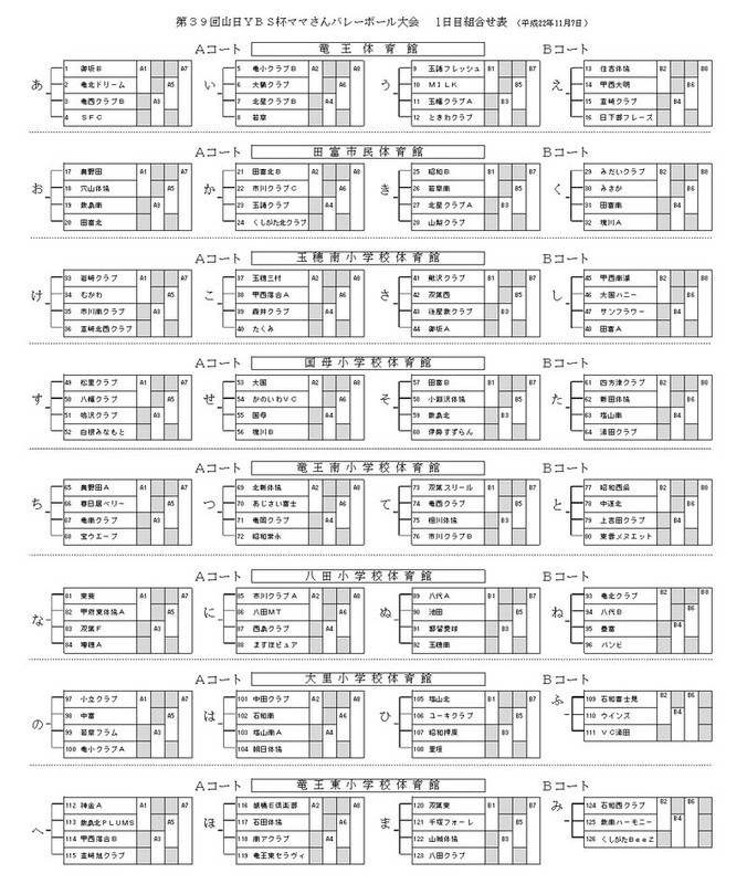 第39回 山日YBS杯ママさんバレーボール大会 山日YBS杯 2010.10.232018.11.27 出場チーム一覧表 & 1日目・組合せ表 & トーナメント表 ▼出場チーム一覧表 ▼1日目・組合せ表 ▼トーナメント表 ※下方からご覧ください。 ◇ ◆ ◇ ▼出場チーム一覧表 ※ ←クリックにて別ウィンドウ表示します。 ▼1日目・組合せ表 ※ ←クリックにて別ウィンドウ表示します。 ▼トーナメント表 ※ ←クリックにて別ウィンドウ表示します。