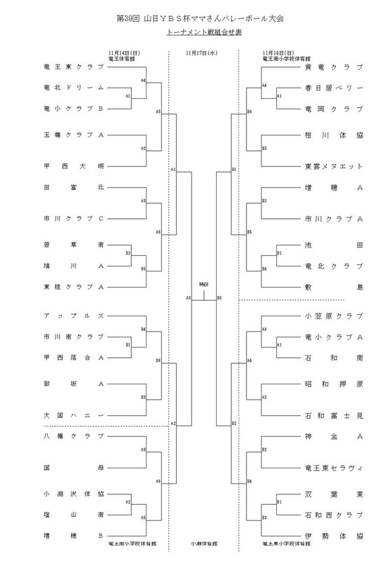 第39回 山日YBS杯ママさんバレーボール大会 山日YBS杯 2010.11.092018.11.27 トーナメント戦組合せ表 ◇ ◆ ◇ ▼出場チーム一覧表 ※ ←クリックにて別ウィンドウ表示します。