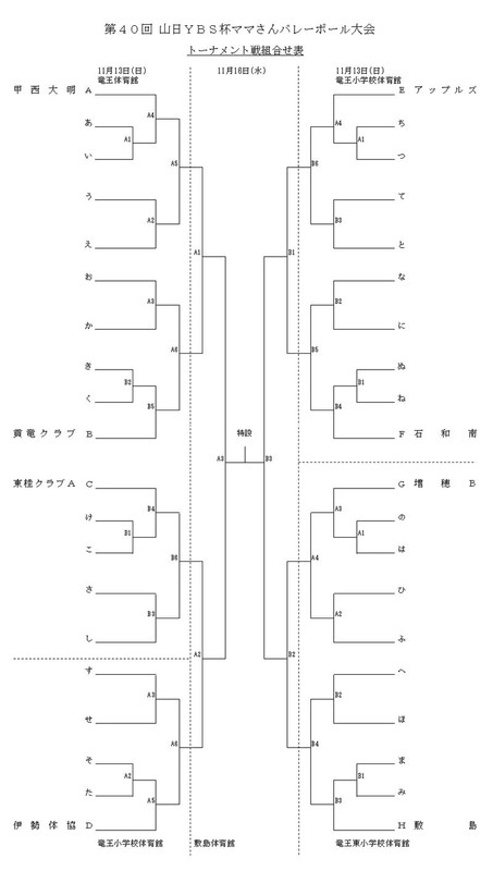 第40回 山日YBS杯ママさんバレーボール大会 山日YBS杯 2011.10.152018.11.22 《 組合せ表 & トーナメント表 》 ( 2011/10/15 ) ▼組合せ表 ※ ←クリックにて別ウィンドウ表示します。 ▼トーナメント表 ※ ←クリックにて別ウィンドウ表示します。