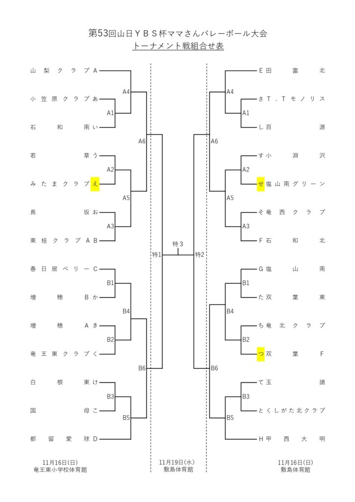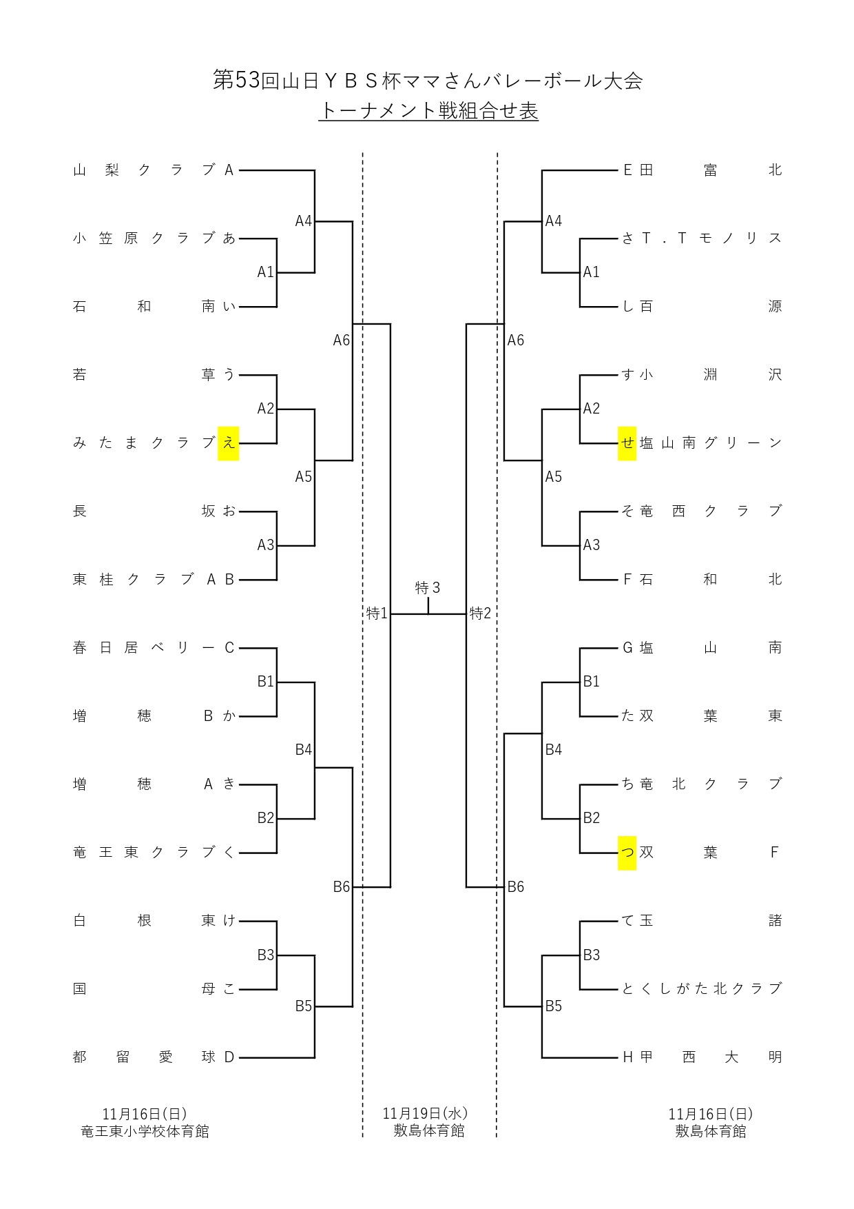 第53回山日YBS杯ママさんバレーボール大会【トーナメント進出チーム】 お知らせ 2025.11.09 大会1日目の対戦結果により、 以下のチームがトーナメント戦の進出となりました。 トーナメント表PDF版はこちら