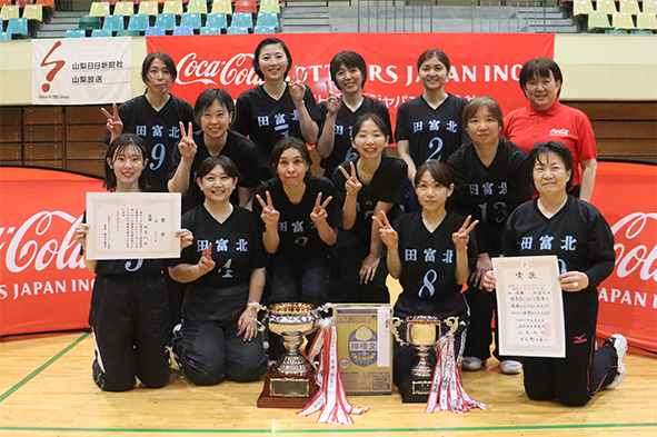 気持ちを切りかえ幅広い攻撃を仕掛ける春日居ベリーはライトセミのブロックポイントやライト中村の高さを活かしたスパイクが決まるも、田富北はバック漆原・佐野・竹野の好レシーブから粘り強くエース三浦にボールをつなぎ連続失点を許さない。19-16で春日居ベリーがタイムアウトを狭んでも主導権を譲らない田富北。最後はエース三浦の強打が決まり21ー17、 2-0で見事田富北が大会3連覇を果たした。